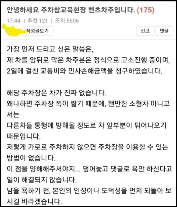 세로로 주차하는 곳에 가로로 주차해 주차구역 3칸을 독차지해 온 ‘민폐 벤츠’ 차주의 후기 글이 뭇매를 맞고 있다.