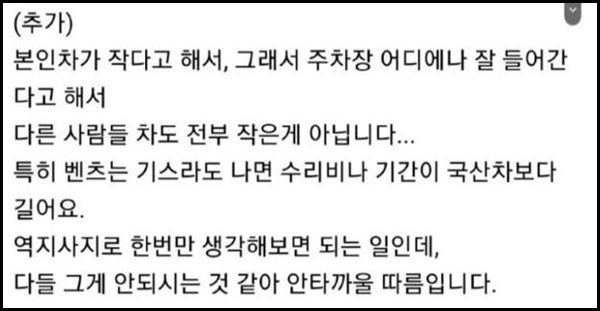 또 A 씨는 추가 글을 통해 “본인 차가 작다고 해서 다른 사람들 차도 전부 작은 게 아니다. 특히 벤츠는 흠집이라도 나면 수리 기간이 국산 차보다 길다”라고 강조했다.