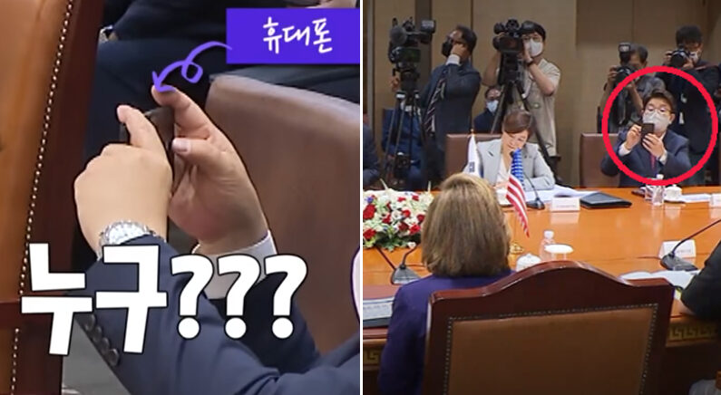 이번에는 국회 회담 중 펠로시 미국 하원의장 측을 향해 휴대폰으로 촬영을 하는 듯한 모습이 포착됐기 때문이다.
