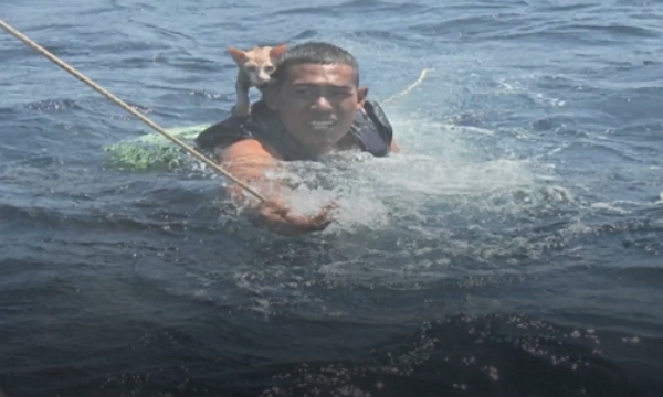 해군은 허리에 밧줄을 맨 채 망설임 없이 바다로 뛰어들었고, 헤엄을 쳐 어선에 남은 고양이들을 구조하러 갔다.