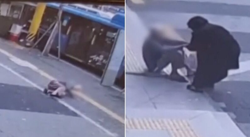 당시 모습이 찍힌 CCTV 영상을 보면 잠옷만 걸친 남성이 느린 걸음을 옮기다 갑자기 옆으로 넘어졌다. 이 모습을 본 사람들이 달려왔고 그 중 한 여성은 남성이 괜찮은지 확인하는 듯 노인의 얼굴을 들여다봤다.