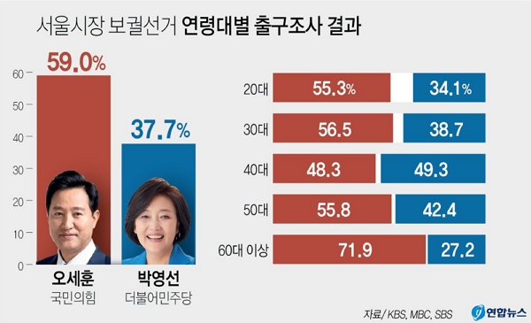 KBS, MBC, SBS가 지난 7일 공동 발표한 출구조사에서 18~19세 및 20대 남성의 72.5%가 오 후보를 찍은 것으로 조사됐다.