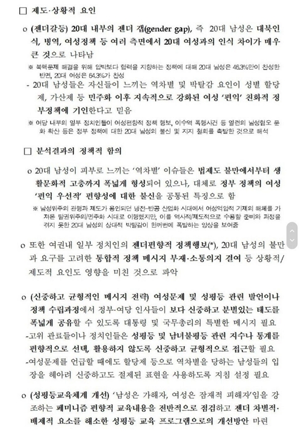 이런 가운데 최근 온라인 커뮤니티에서는 20대 남성 지지율 하락 요인을 분석한 정부 보고서가 재조명됐다.