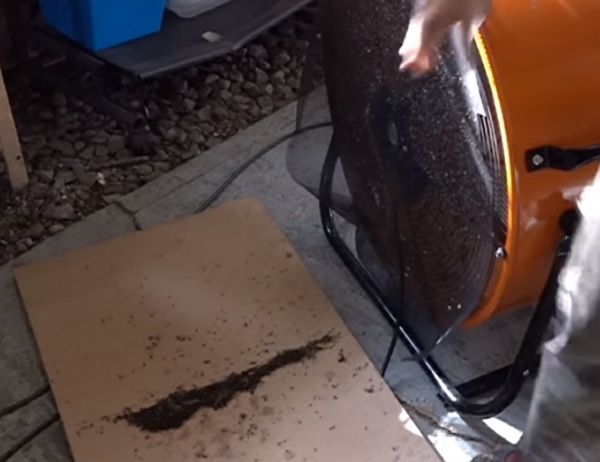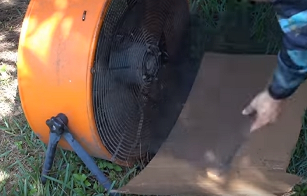 드라이아이스로 모기들을 유혹한 뒤, 대형 환풍기 한쪽 면에 끈끈이를 설치해 트랩을 만들었다.