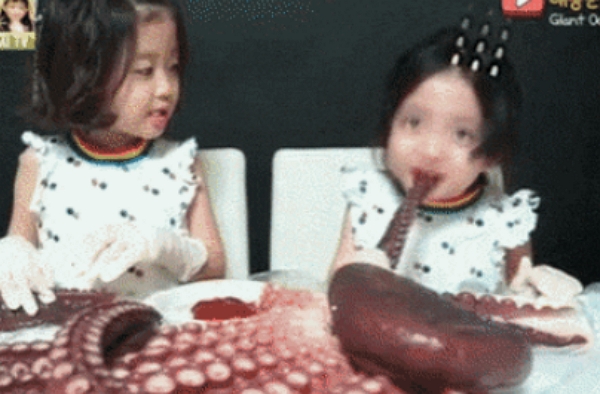 힘겹게 대형문어를 먹는 6살 쌍둥이 자매의 영상이 공개된 후 파문이 일고 있다.